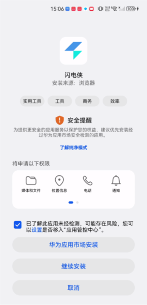3、勾选“已了解此应用未经检测”等提示选项后,点击继续安装。