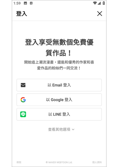 1、首次进入WEBTOON台版app,需完成用户登录操作;因是台湾地区应用,未开启加速器时,加载速度可能较慢,耐心等待即可。