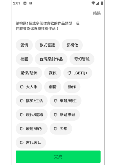 2、登录成功后,可选择智能推荐的漫画类型,支持多个类型同时勾选,系统会根据选择推送对应题材的漫画。
