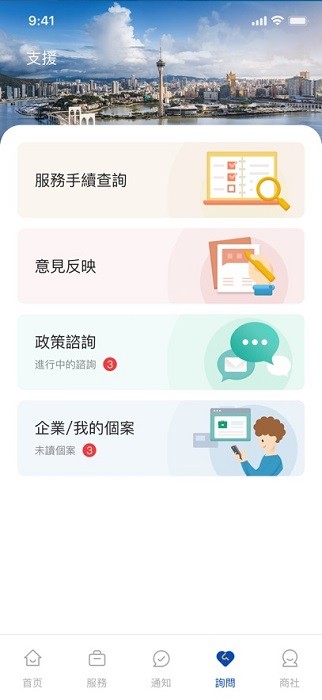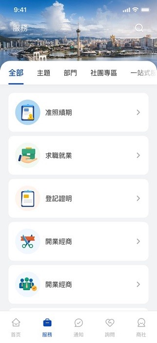 商社通是一款由澳门特区政府行政公职局推出的工商服务软件,支持个人、企业和各社团的工商注册登记,支持快速的线上办理各种工商事务,审核速度快,服务分类全,让大家在澳门工作有更多便利。
