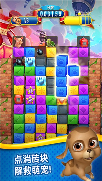 宠物拯救传奇以可爱卡通风格打造休闲消除体验,通过消除相邻同色砖块推动宠物降落地面,玩法兼具简单操作与策略思考。