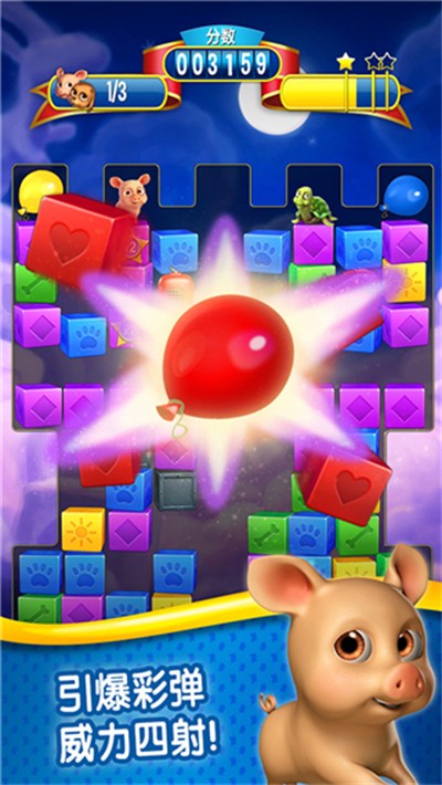消除砖块的同时推动关卡内宠物降落地面,达成该条件方可顺利完成关卡挑战。
