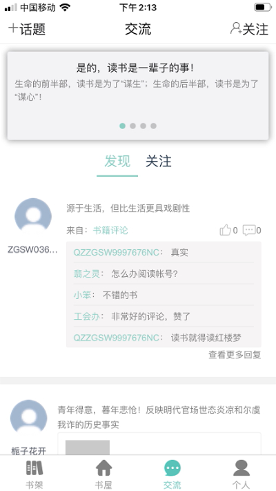 3、【发现】里可以看到各位书友动态。
