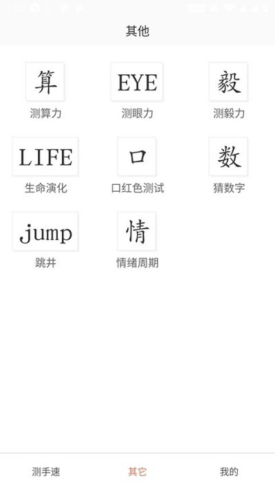 测手速是一款专注手机手速测试的综合类工具软件,内置16种模块功能与多样测试模式,包含测算力、测眼力、测毅力、猜数字、生命演化等内容。软件可精准测试手速与反应速度,帮助用户了解自身反应能力,后续还会持续新增功能模块,支持测试结果分享至社交平台。