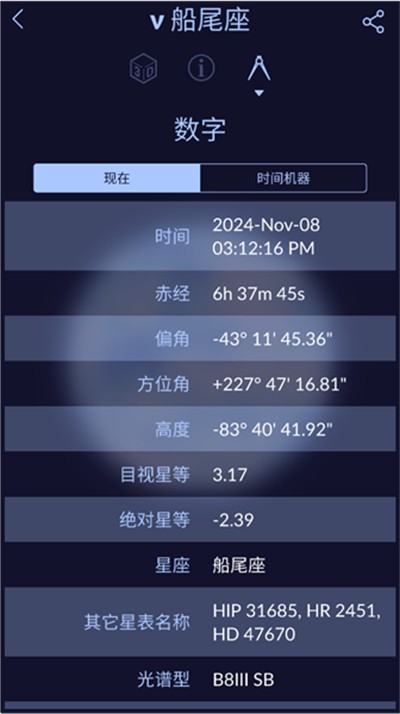 2、点击当前星空,可查看实时星空3D模型,识别猎户座金牛座等星座,还能调整时间,查看不同时段的星空状态。