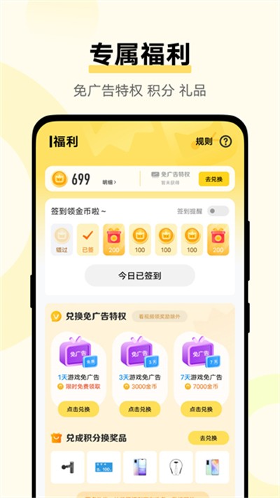 4、点击底部导航栏的福利,进入福利页面,点击立即领取,可领取无广告特权与登录积分奖励。