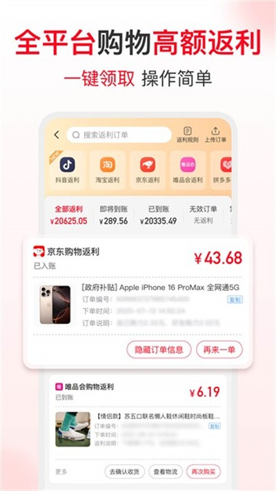 2、切换到返利板块,可选择淘宝唯品会等平台的超级返入口,查看各类商品的返利金额与售价,筛选高返利的优惠商品。