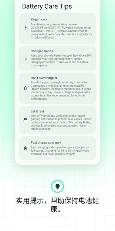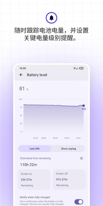 智能提醒低电量充电、满电断电,帮助用户养成科学充电习惯,延长电池寿命。
