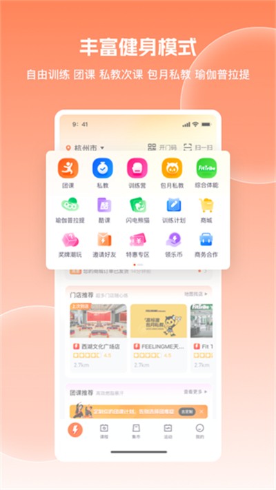 1、健身模式丰富,涵盖自由训练、团课、私教、瑜伽、普拉提等多种选择。