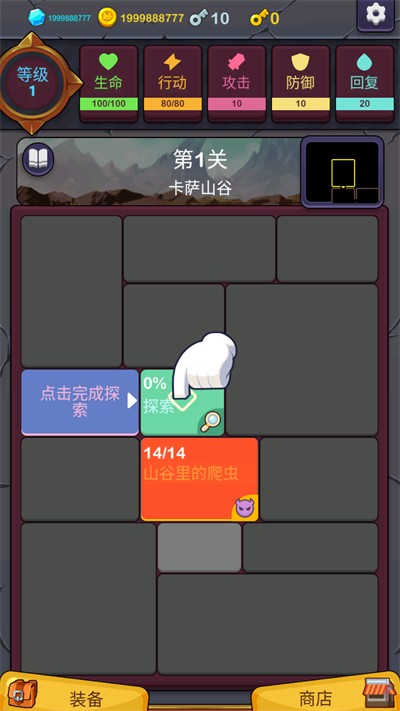 4、探索完成后,点击怪物格子,击败爬虫推进关卡。