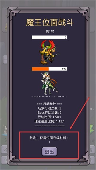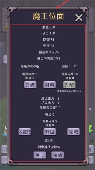 2、回到主界面后,点击屏幕触发点击打魔王操作,攻击怪物获取金币、铁矿石等奖励,提升层数。