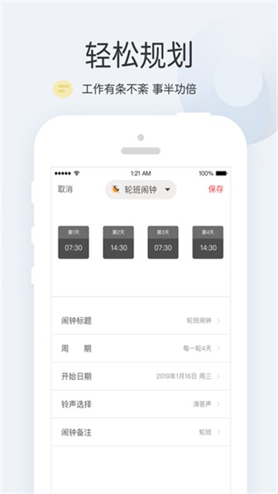 【轮班适配】专为轮班工作人群优化,可设置不规则时段提醒,贴合特殊作息安排。