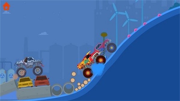 3、操控大脚车碾压障碍车辆,翻越坡道,超越对手抢占领先。