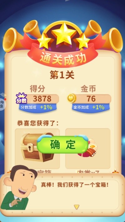 3、成功完成当前关卡目标后,会进入结算界面,点击“确定”即可返回关卡流程并解锁下一阶段内容。