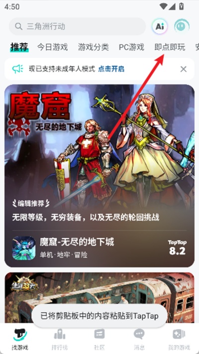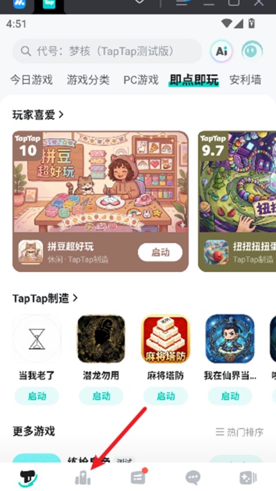 1、打开TapTap应用,在首页下方找到并点击“即点即玩”入口。