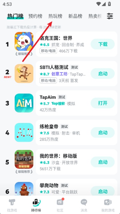 3、在排行页面中选择“热玩榜”标签,查看热门游戏榜单。
