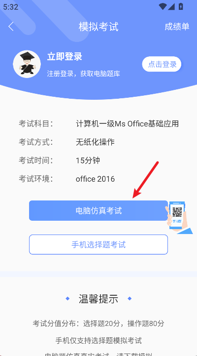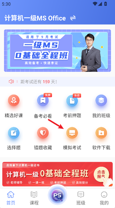 1、 进入APP后,点击“模拟考试”选项进入相关页面。