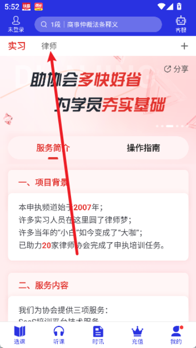 1、进入应用后点击页面上方律师入口进入法律课程与相关功能分类页面。