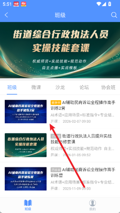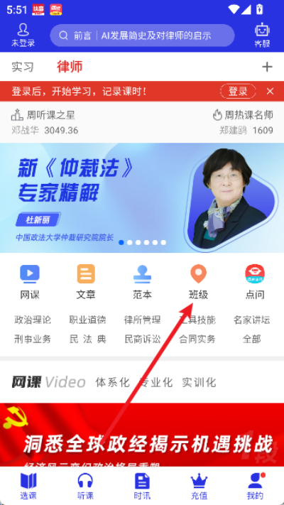 2、在律师页面中找到班级选项并点击进入班级课程管理与学习页面。