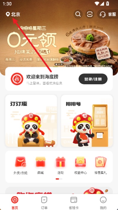 1、打开海底捞手机点餐软件进入主界面,在城市选择区域中找到“北京”并点击进入地区切换页面。