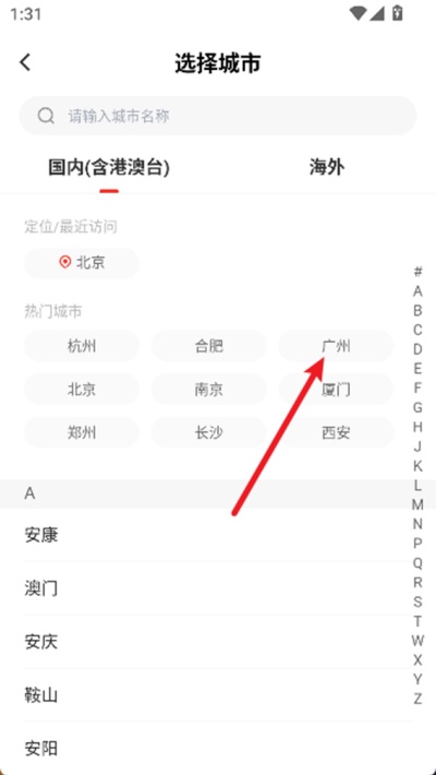 2、在地区切换列表中找到并选择“广州”选项,完成当前定位城市的切换操作。