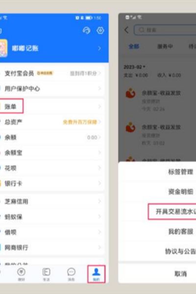 1、打开支付宝,依次点击「我的」-「账单」,再点击右上角三个点,选择「开具交易流水证明」选项进入申请页面。