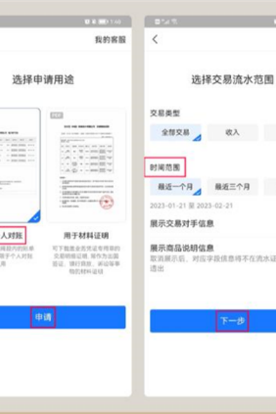 2、选择「用于个人对账」后点击「申请」,根据需求选择账单导出的时间范围,确认无误后点击「下一步」继续操作。