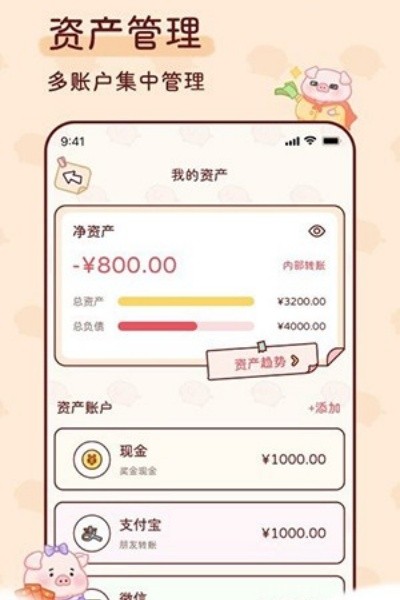 支持多个账户在同一平台统一管理,不同账户的收支记录清晰分类,整体财务状况一览无余,有效提升个人账务管理的条理性与效率表现。