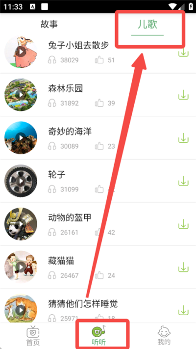 1、进入竹兜育儿app后,在“听听”栏目中找到儿歌专区并点击进入播放页面。