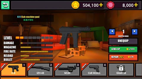 1、武器界面,点击LEVEL UP按钮,对当前装备的K-9冲锋枪进行等级提升,增强武器属性。