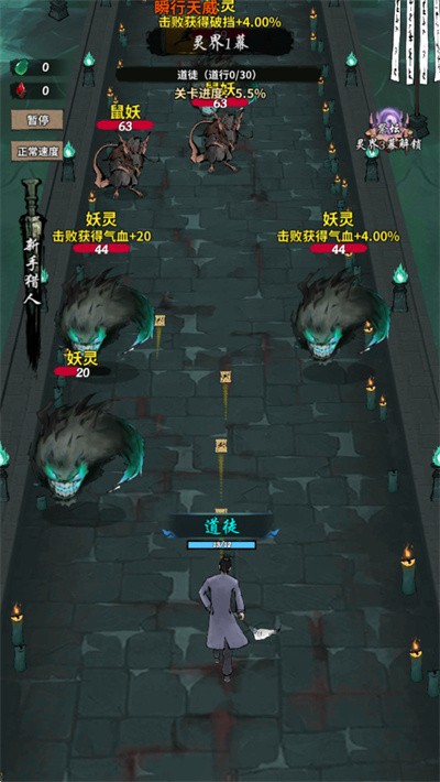 2、进入战斗场景后,按住屏幕左右滑动即可自由控制角色走位,向前方不断逼近妖灵怪物,击杀怪物可提升自身攻击与气血属性,稳步推进关卡整体进度。