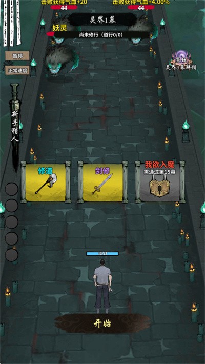 1、进入灵界第一幕关卡界面,可选择修道剑修或是暂未解锁的我欲入魔职业,选定职业后点击下方开始按钮,正式开启斩妖闯关的冒险旅程。