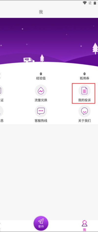 1、打开圆通快递应用进入首页后点击底部菜单栏中的【我】选项,在个人中心页面找到“我的投诉”入口并进入查看相关记录。