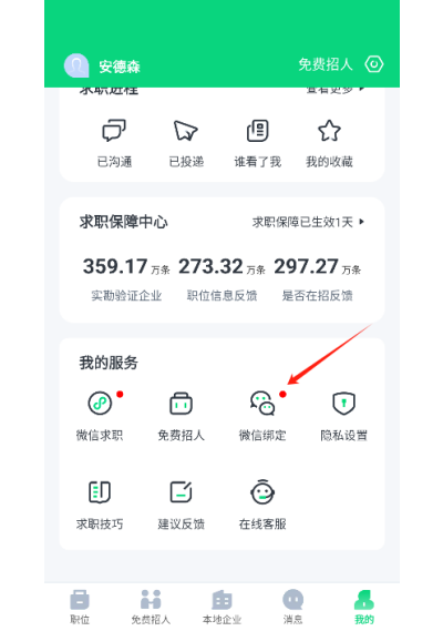 2、在个人中心页面,定位我的服务区域,点击微信绑定选项进入绑定界面。