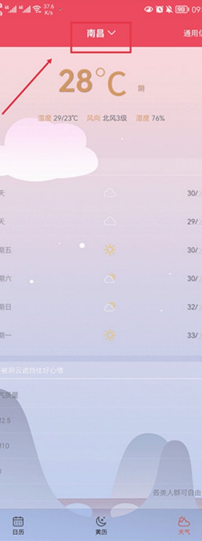 3、进入天气页面后,点击顶部城市名称即可更换查看其他地区的天气情况。
