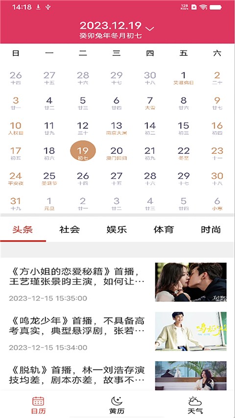 蜜柚日历App是一款轻量级且实用性极强的生活日历工具软件,集日历查询、黄历信息、天气预报及资讯阅读于一体,为用户提供一站式生活信息服务体验。软件界面简洁清爽,功能操作直观便捷,可快速查看公历农历转换、节日节气以及每日宜忌事项。同时支持实时天气更新与未来一周天气预测,帮助用户提前规划出行安排。此外还提供头条资讯与日程提醒功能,让用户在一个应用中即可掌握生活与天气动态,是一款兼具实用性与便捷性的生活助手工具。