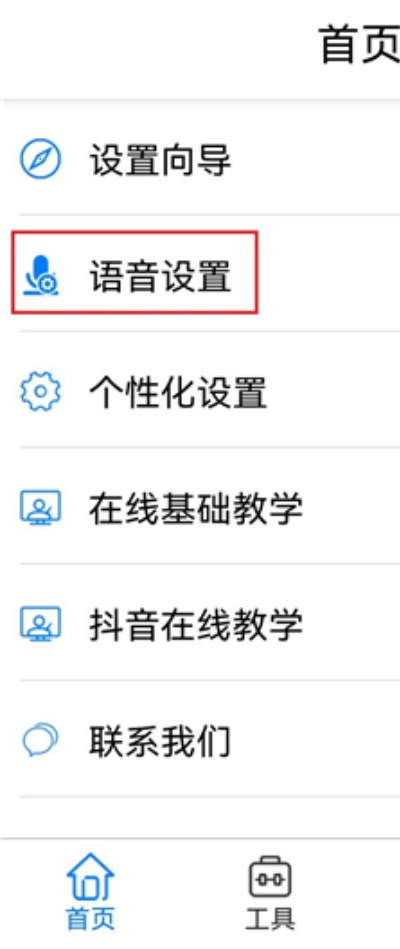 1、进入保益悦听应用后,在首页功能区域中找到并点击第二个“语音设置”入口,进入语音相关参数配置页面。
