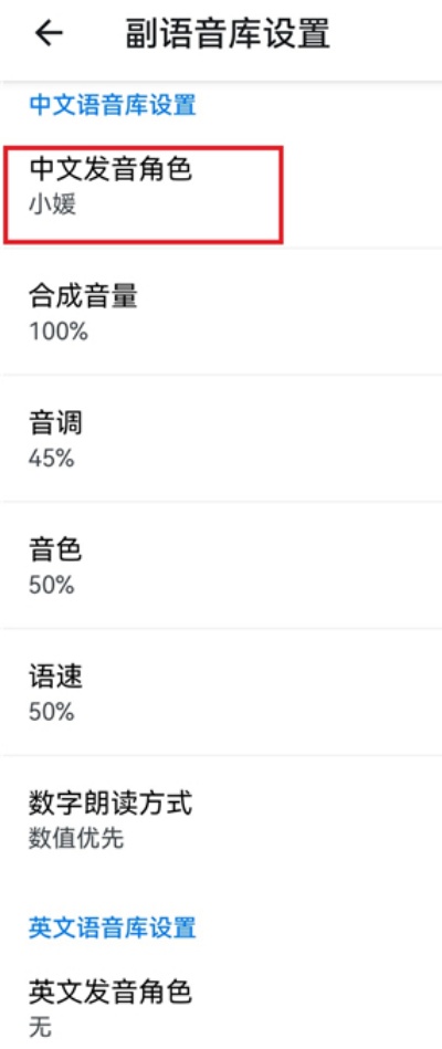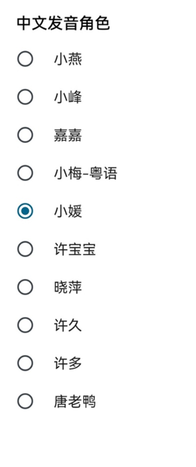 5、在中文发音角色列表中可根据使用习惯自由选择合适语音角色,点击对应选项即可立即完成设置生效。
