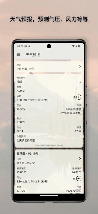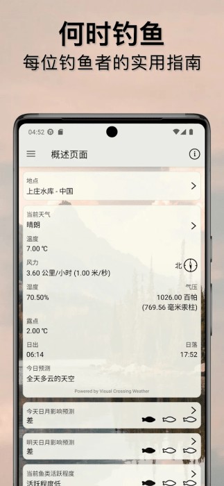 内置晴雨表功能,提供实时气压变化数据及未来两天气压预报,助力用户判断鱼类觅食活跃度,精准选时。