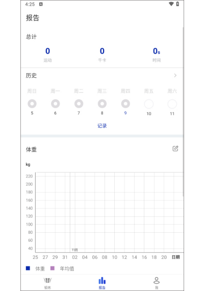 3、进入软件“报告”板块,准确填写自身身高、体重信息,同时记录每次运动时长,方便软件精准统计健身数据。