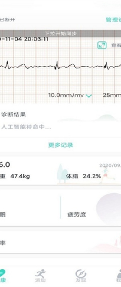3、进入健康板块后可查看心电图历史记录数据,并支持AI智能分析功能,帮助更直观了解身体健康变化情况。