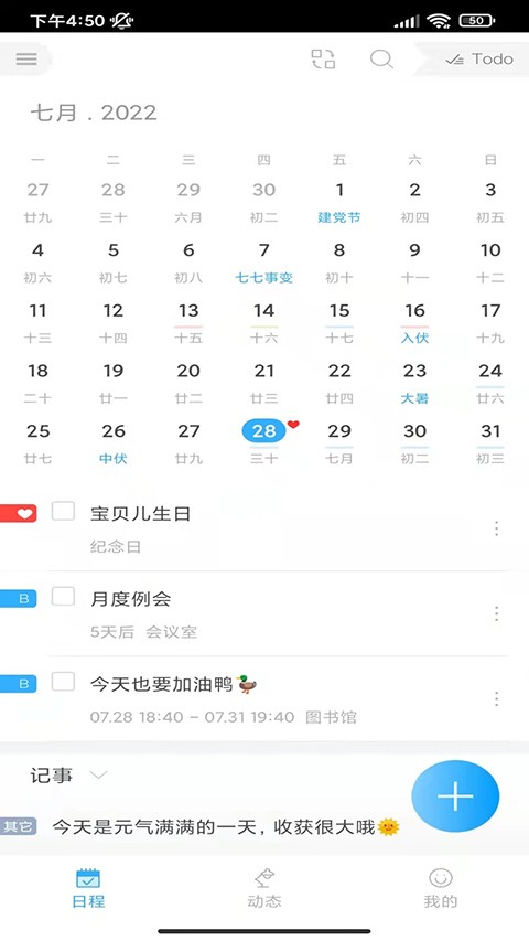 2、点击页面中的加号按钮,可以快速为当前时间新增日程安排。