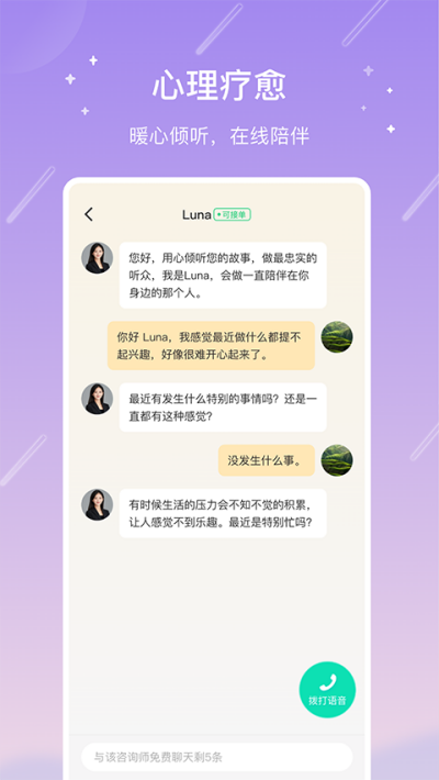 打造温和治愈的交流氛围,接纳各类情绪倾诉,帮助用户释放生活与心理压力。