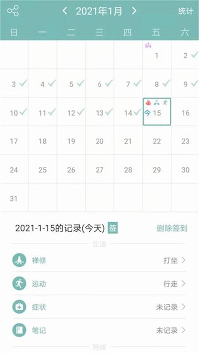 1、支持记录日历与多维度统计图表,清晰展示周、月、年戒持历程,进度一目了然。