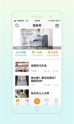 1、打开软件进入首页界面,可看到会诊区资料区大讲堂等多个功能入口,还能浏览社区内宠友发布的宠物病症求助帖子,查看相关病例讨论内容。