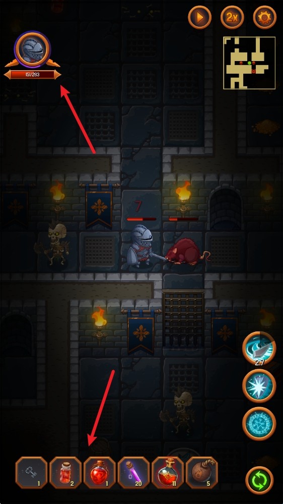 3、战斗中角色血量不足时,点击左下角的药瓶按钮,使用药瓶恢复生命值。