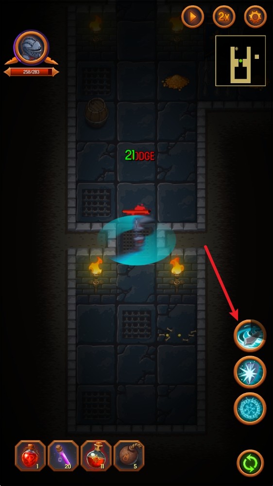 4、遇到新敌人时,点击右下角的技能按钮,释放攻击技能,快速击败敌人推进关卡。