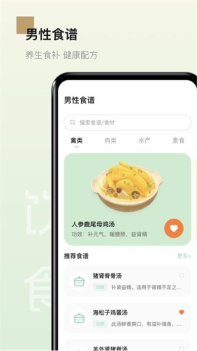 1、食补首页主打男性专属膳食调理食谱,支持食材与食谱关键词搜索,细分禽类肉类水产素食四大食材分类,涵盖人参鹿尾母鸡汤等多种养生滋补汤品食谱。