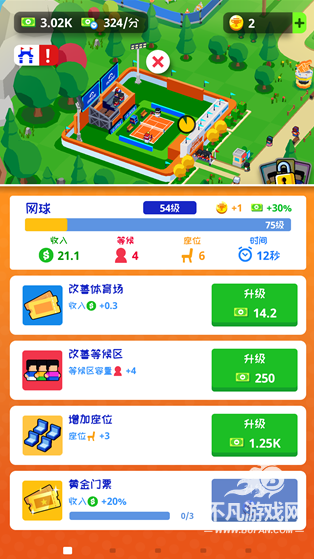 4、升级完成后,返回主界面,继续引导游客入场,等待网球场产出收益即可。