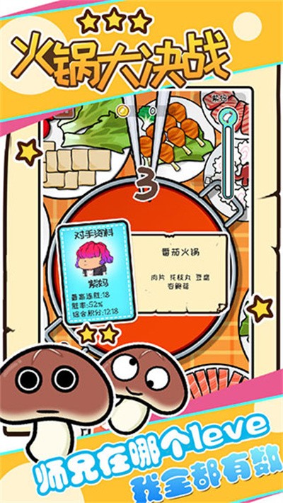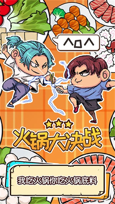 火锅大决战是一款暖色调卡通渲染的休闲对战手游,场景设定在一家热闹的火锅店餐桌上。玩家操控筷子在沸腾的汤底中抢夹食材,豆腐、肉片、杏鲍菇等菜品从锅底浮起时伴有蒸汽飘散特效。每局对战的胜负由夹菜积累的饱食度决定,饱食度满格的一方直接获胜。惩罚机制允许玩家自定义输家需要完成的任务,比如学猫叫或者做鬼脸,娱乐性质远大于竞技性。匹配模式提供单人练习与联机对战两种选择。